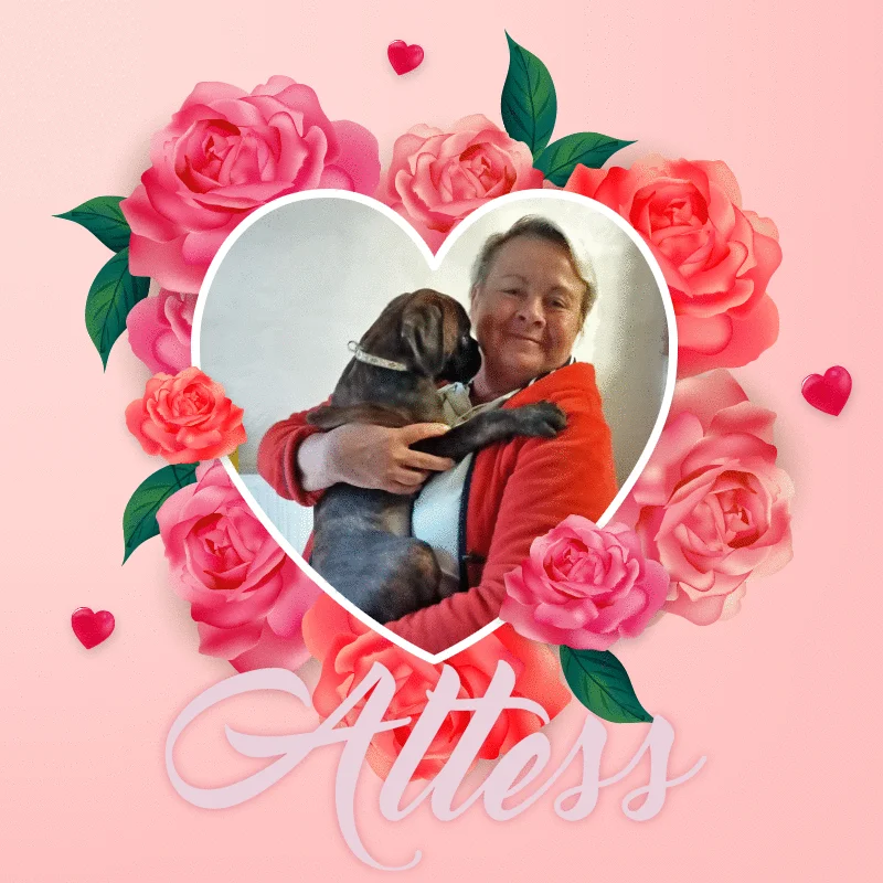 La femelle Altess bringée à 55 jours : Altess va rejoindre une famille qui a eu dans le temps Urielle du Dolon née chez nous, une soeur d'Ucello du Dolon le père de Giotto (qui est lui-même le père de la mère de Thalie...). Quelle belle suite de l'histoire : voir plus bas Altess et sa maîtresse le jour de son départ de l'élevage...